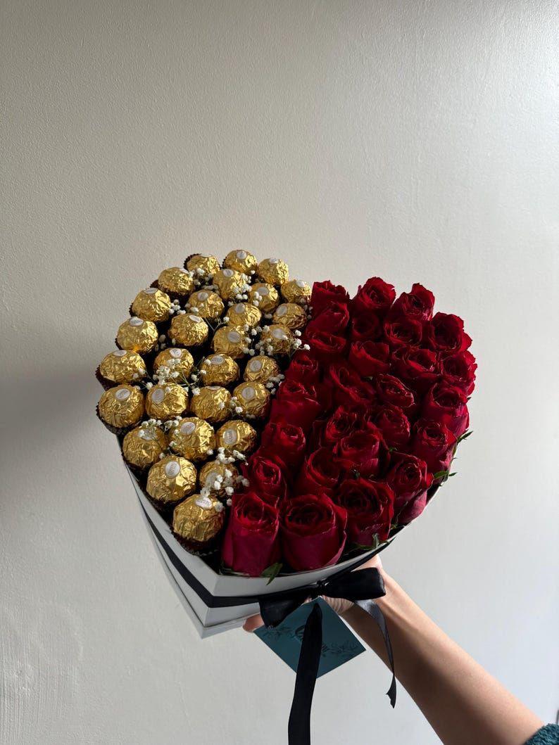 A perfect blend of romance and sweetness featuring deep red roses and premium Ferrero Rocher chocolates. Elegantly arranged in a heart-shaped box, this is the ultimate gift to express your love and make any occasion unforgettable.