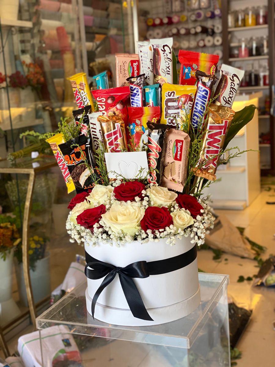 A stunning fusion of romance and indulgence featuring a premium arrangement of fresh red and white roses paired with an assortment of favorite chocolates. Elegantly presented in a white round gift box with a silk black ribbon, it’s the perfect surprise for birthdays, anniversaries, or a “just because” treat.