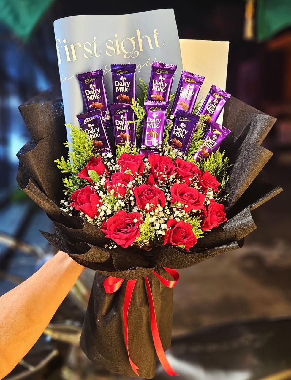 Why choose between flowers and chocolates when you can give both? Our Red Rose & Dairy Milk Chocolate Hybrid Bouquet is designed to make a grand impression. This handcrafted arrangement features a lush bed of vibrant red roses accented with dainty white baby’s breath and fresh green fillers, creating a classic symbol of deep affection.