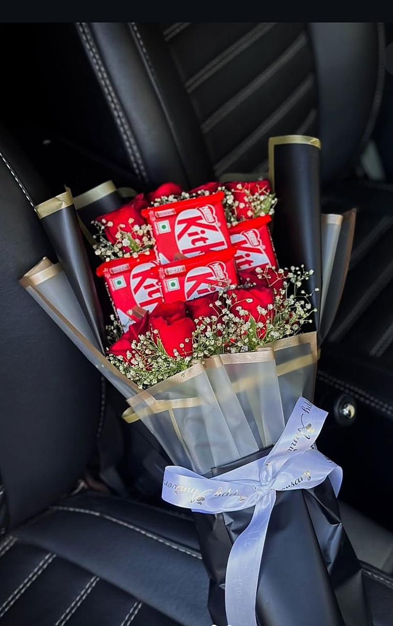 Celebrate your special day with a perfect blend of romance and sweetness. This elegant hand-tied bouquet features premium red roses nestled among classic KitKat chocolate bars and delicate baby’s breath, wrapped in sophisticated black and gold layers.